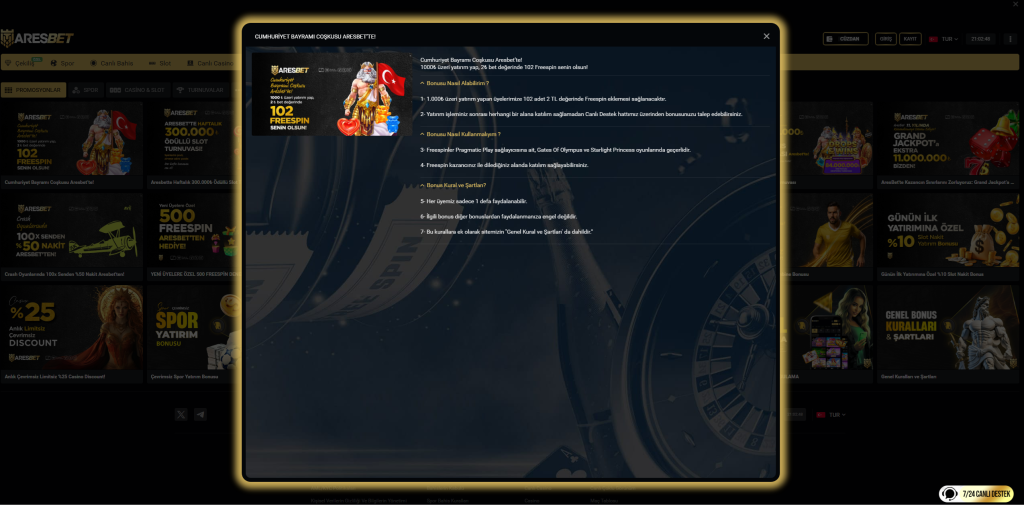 Cumhuriyet bayramımızın 102. yılı kutlu olsun! Aresbet cumhuriyet bayramı coşkusu sürüyor. Cumhuriyet bayramımızın 102. yılına özel yeni bir bonus ile bahis severlerin kazanç fırsatlarını genişletiyoruz. Aresbet üzerinden bahislerini gerçekleştiren kullanıcılar freespinler ile ekstra bahislerini gerçekleştiriyor ve kazançlarını arttırıyor. Cumhuriyet bayramına özel freespinler nasıl alınır ve katılım şartları nedir? Katılım şartları ve kurallara adım adım uyarak freespinleri elde etmek için;